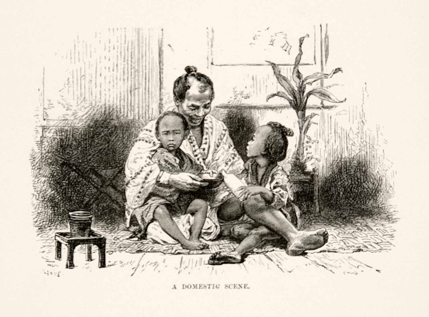 This is an original 1874 black and white in-text wood engraving of a traditional Japanese domestic scene.