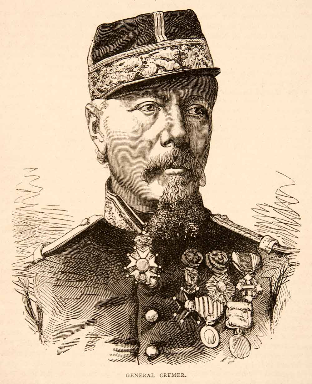 This is an original 1874 black and white in-text wood engraving portrait of General Cremer.