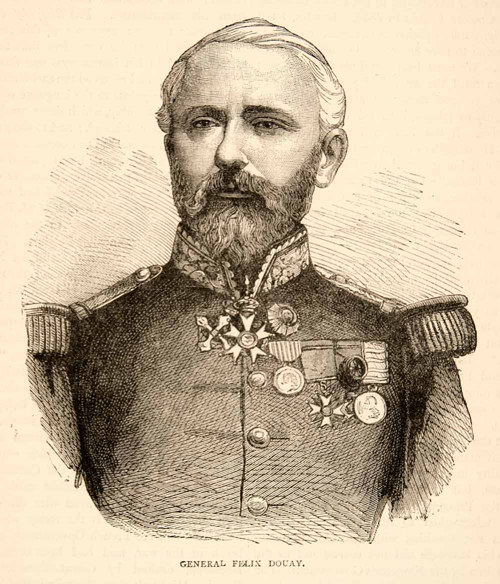 This is an original 1874 black and white in-text wood engraving portrait of Félix Douay, who was a French Army General.