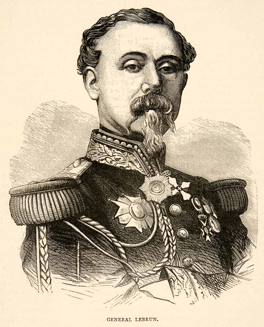 This is an original 1874 black and white in-text wood engraving portrait of Barthélémy Louis Joseph Lebrun, who was a French General.