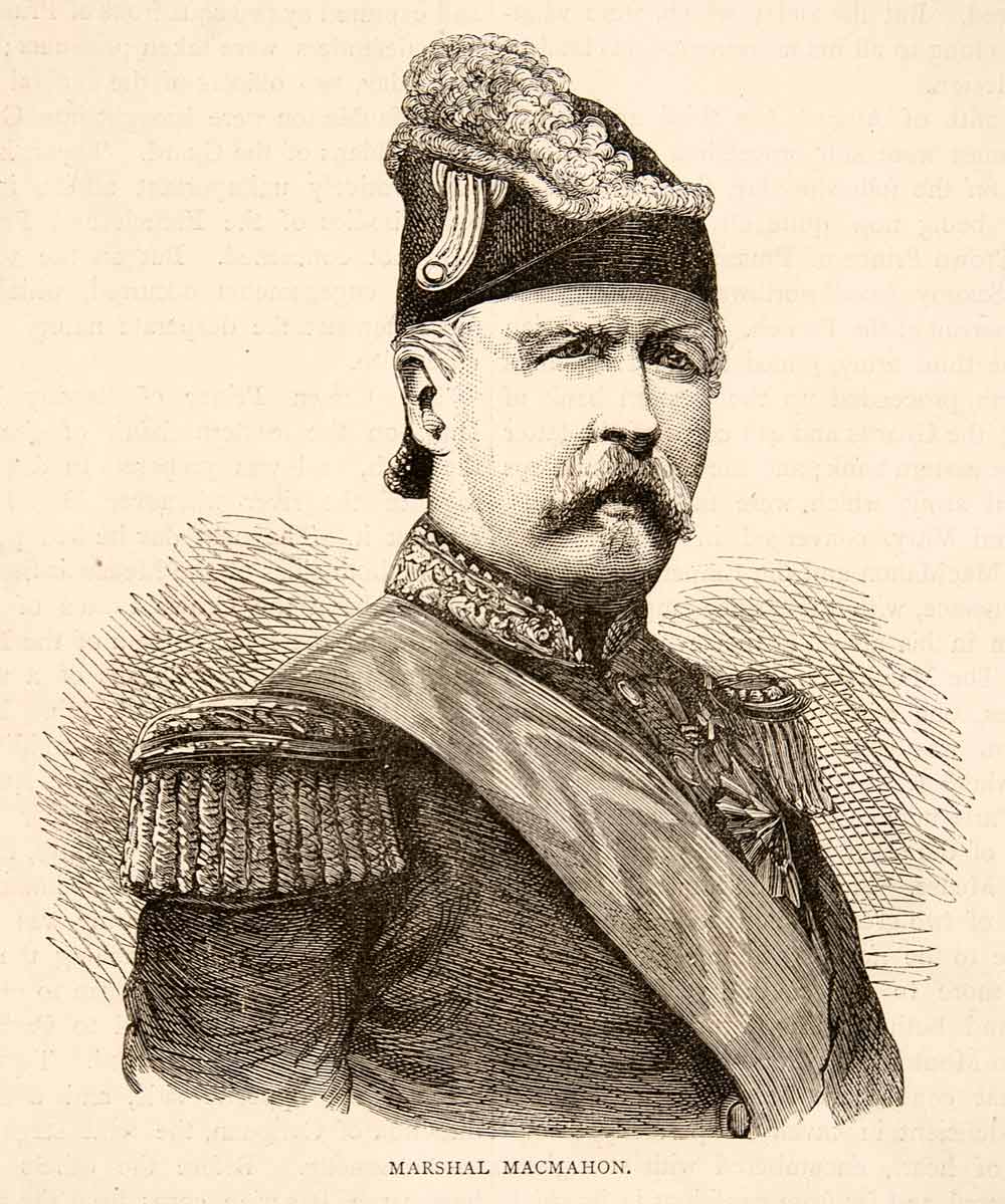 This is an original 1874 black and white in-text wood engraving of Marshal Patrice Macmahon, who was also the Duke of Magenta.