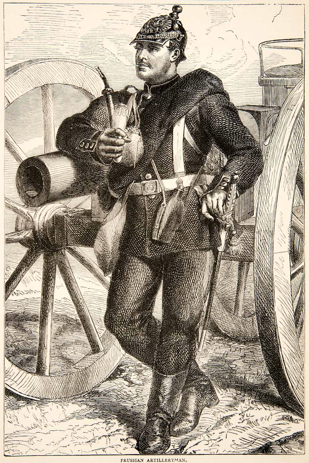 This is an original 1874 black and white in-text wood engraving of a Prussian Artilleryman during the Franco-Prussian War.
