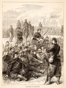 This is an original 1874 black and white in-text wood engraving of a group of prisoners in Belleville, Paris.