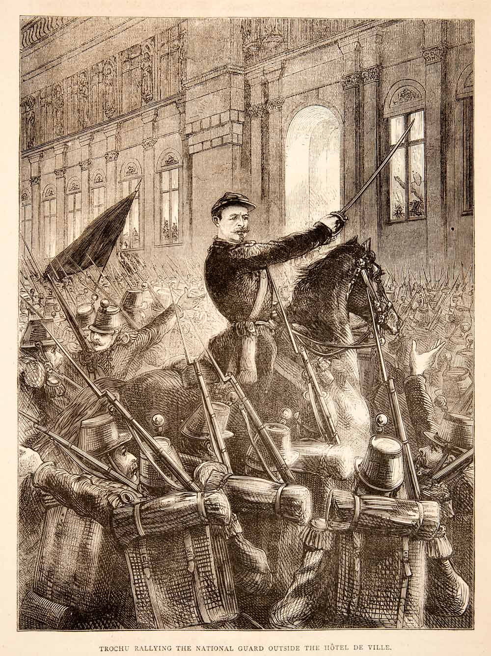 This is an original 1874 black and white in-text wood engraving of Trochu Rallying the National Guard outside the Hotel de Ville during the Franco-Prussian War.