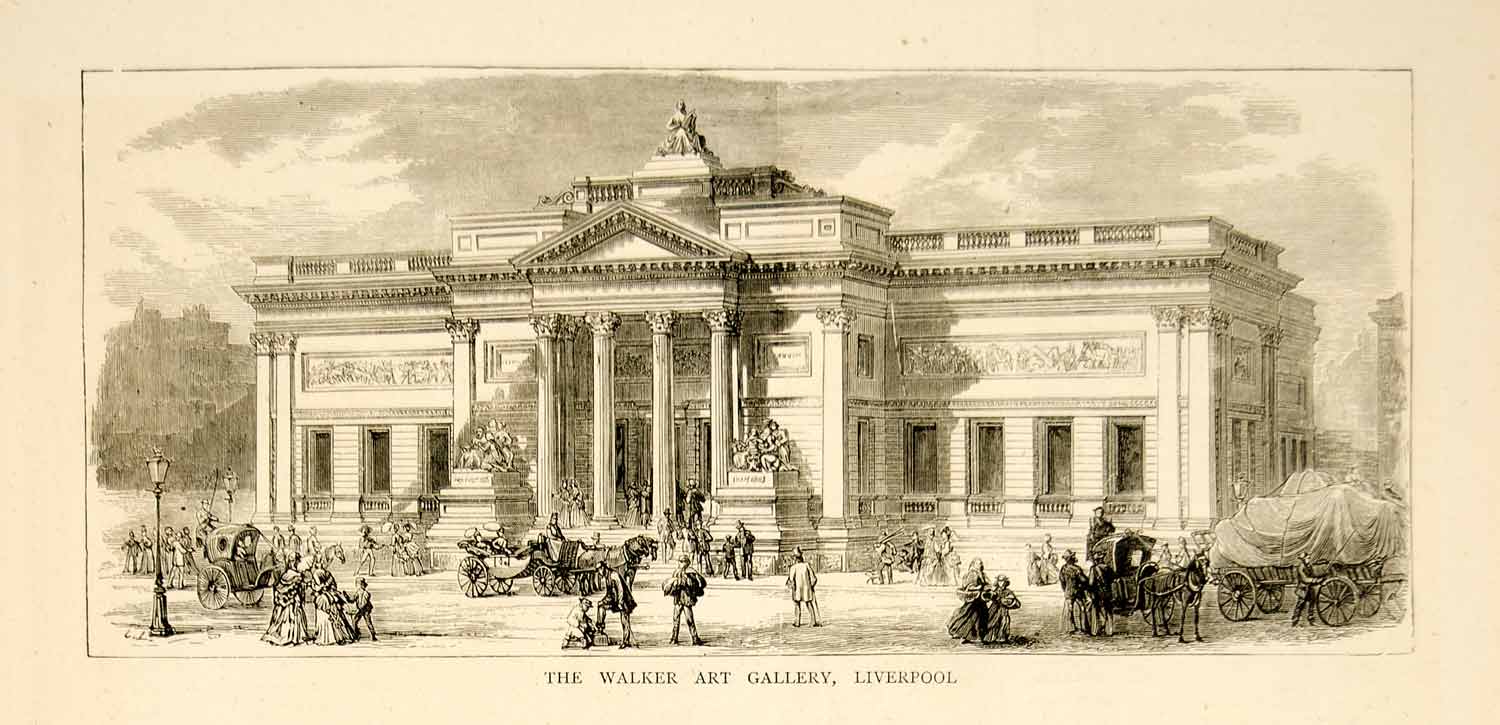 This is an original 1874 black and white in-text wood engraving of an illustration that depicts the historic facade of the Walker Art Gallery building at William Brown Street in Liverpool, England, United Kingdom, during the Victorian era.