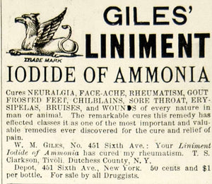 This is an original 1875 black and white print ad for Giles' Liniment Iodide of Ammonia "Cures neuralgia, face-ache, rheumatism, gout, frosted feet, chilblains, sore throat, erysipelas, bruises, and wounds of every nature in man or animal."