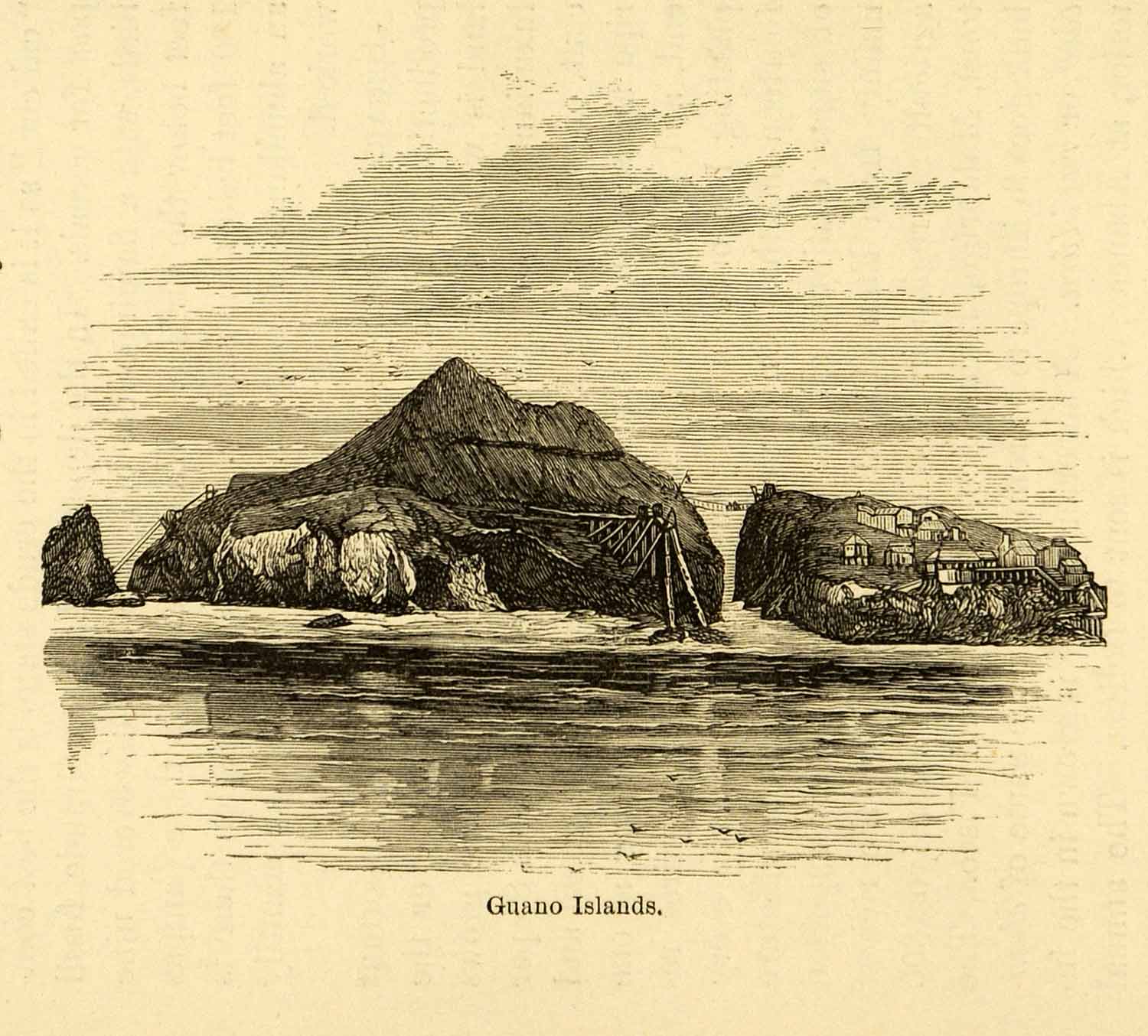 This is an original 1875 black and white lithograph in text of the Guano Islands. The Guano Islands in the 1840's became prized for its fertilizer and saltpeter. In 1855 the U.S. learned of its guano deposits that lead congress to pass the Guano Islands Act so they could take advantage of the deposits.