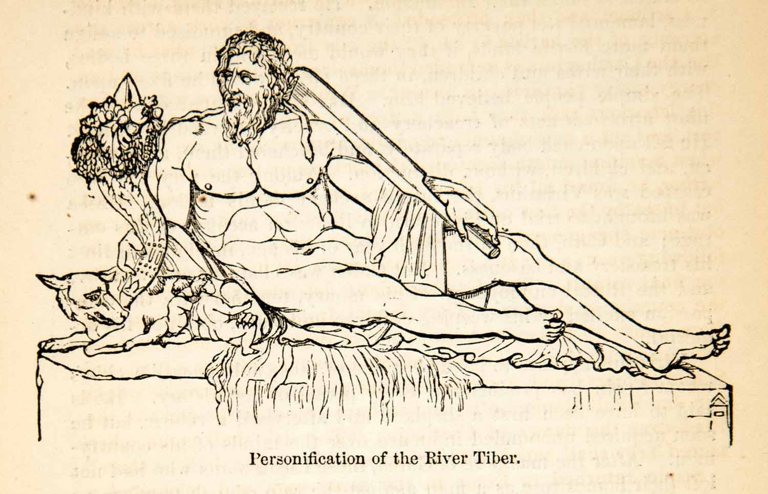 This is an original 1875 black and white relief line-block print of a statue of the personification of the River Tiber.