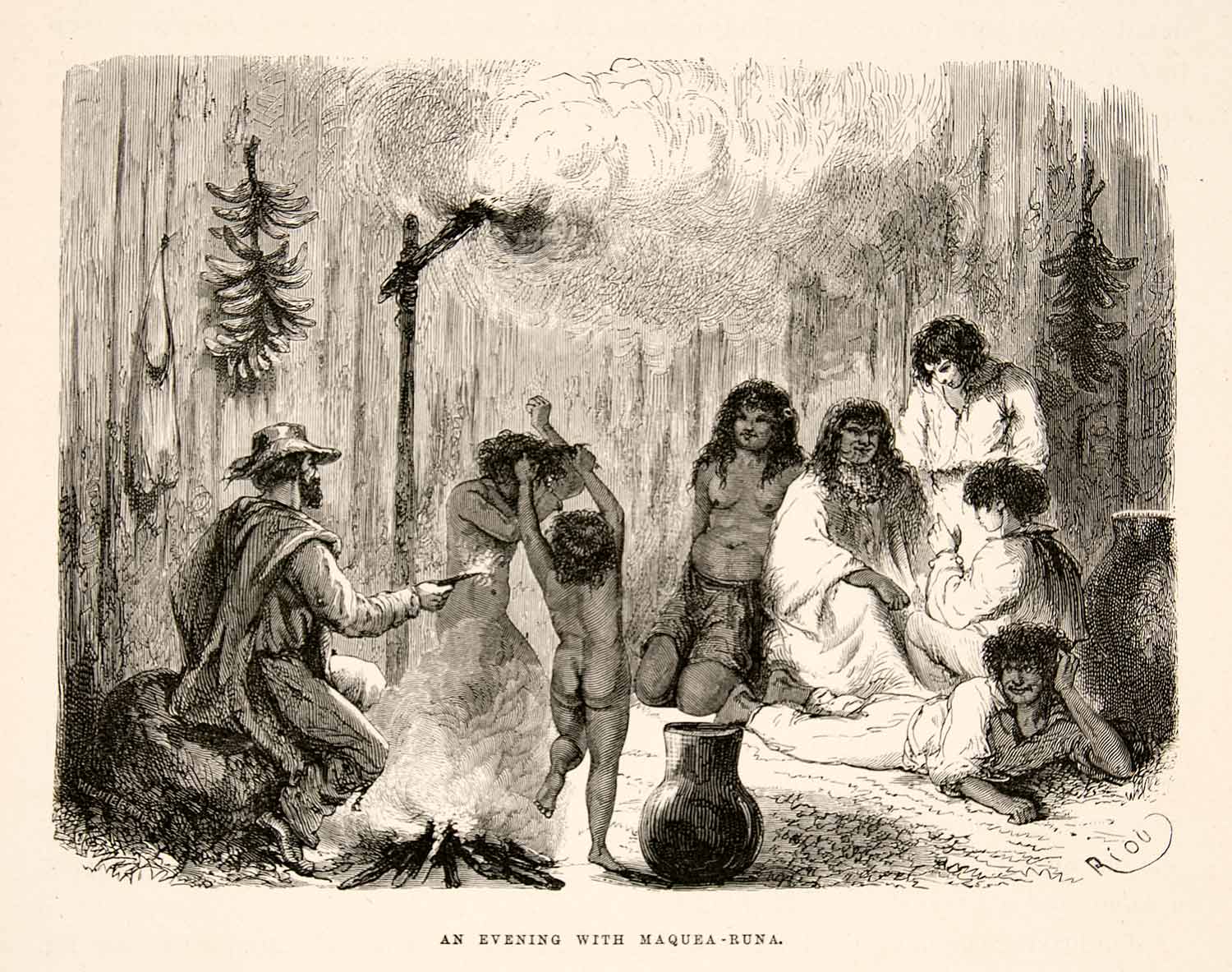 Keywords specific to this image: Cook, Child, Dance, Native, Ethnic, Indigenous, Women, Rainforest, Jungle, Outdoors, Nature, Tropics, Amazon, Ceramic, Pot, Performance, Pantomime, Entertainment