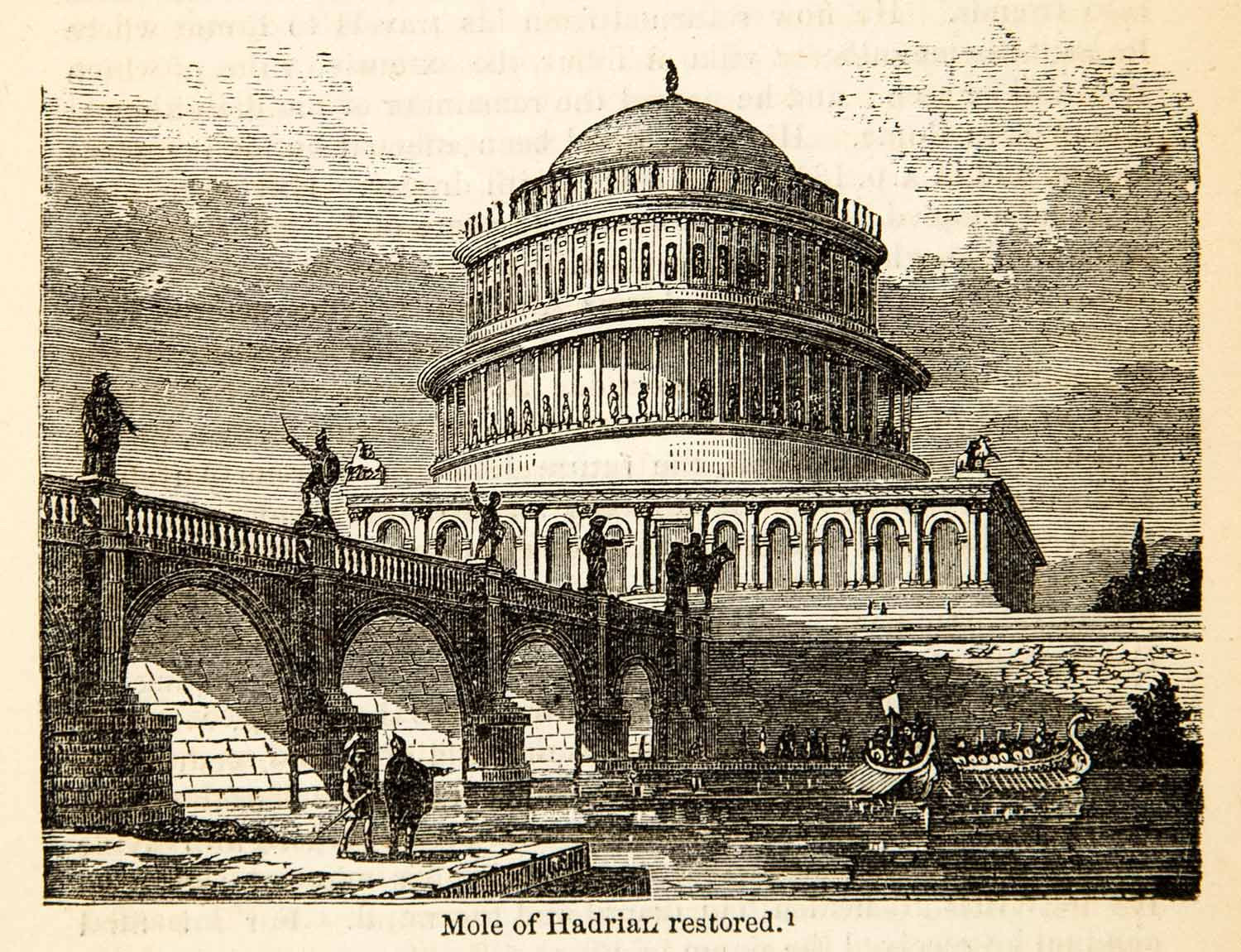 This is an original 1875 black and white in-text wood engraving of a restored representation of the Mole of Hadrian in Italy.