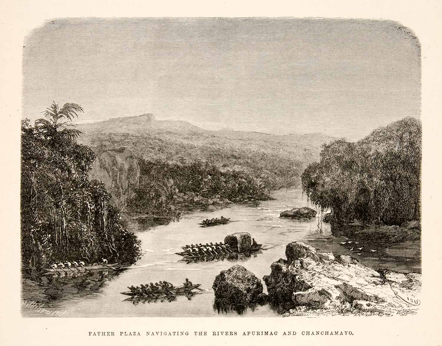 Keywords specific to this image: Peru, South America, Rainforest, Landscape, Waterway, Tropics, Jungle, Rowers, Natives, Boats, Missionary, Jesuit, Navigation, Sailors, Transport, Vegetation, Rocks, Outcrop, Amazon