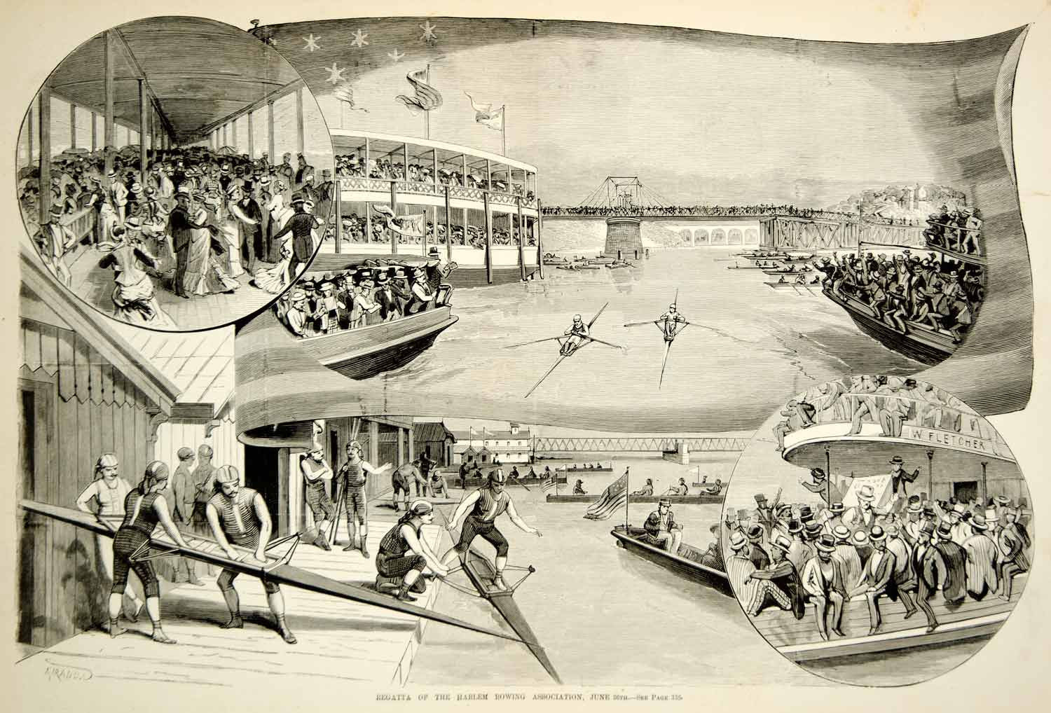This is an original 1875 black and white in-text wood engraving with images from the regatta of the Harlem Rowing Association held on June 26, 1875.