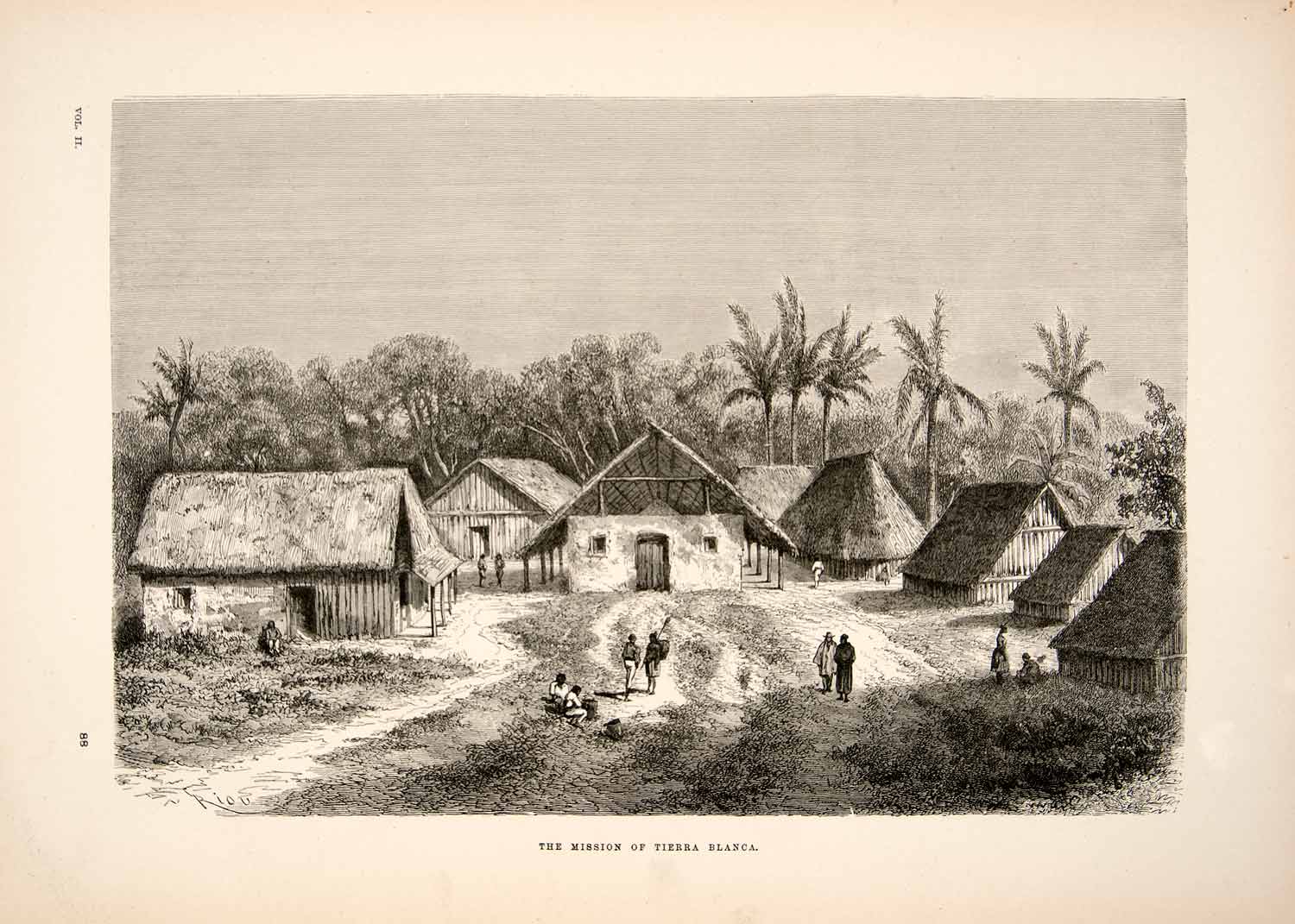 Keywords specific to this image: Village, South America, Hut, Natives, Indians, Jungle, Palm Trees, Tropics, Church, Missionaries, Public Square, Rural, Nature, Outdoor, Street, Canopy