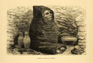 This is an original 1875 black and white wood engraving of an Aymara Indian Mummy at a Chullpa (Chulpa) located in the Sillustani, a pre-Incan burial ground near Puno, Peru. The Chullpa is an ancient Aymara tower and tombs, constructed for a noble family, in which the corpses were placed with their clothing and belongings. The Aymara people are an indigenous ethic group in the Andes and other regions of South America.
