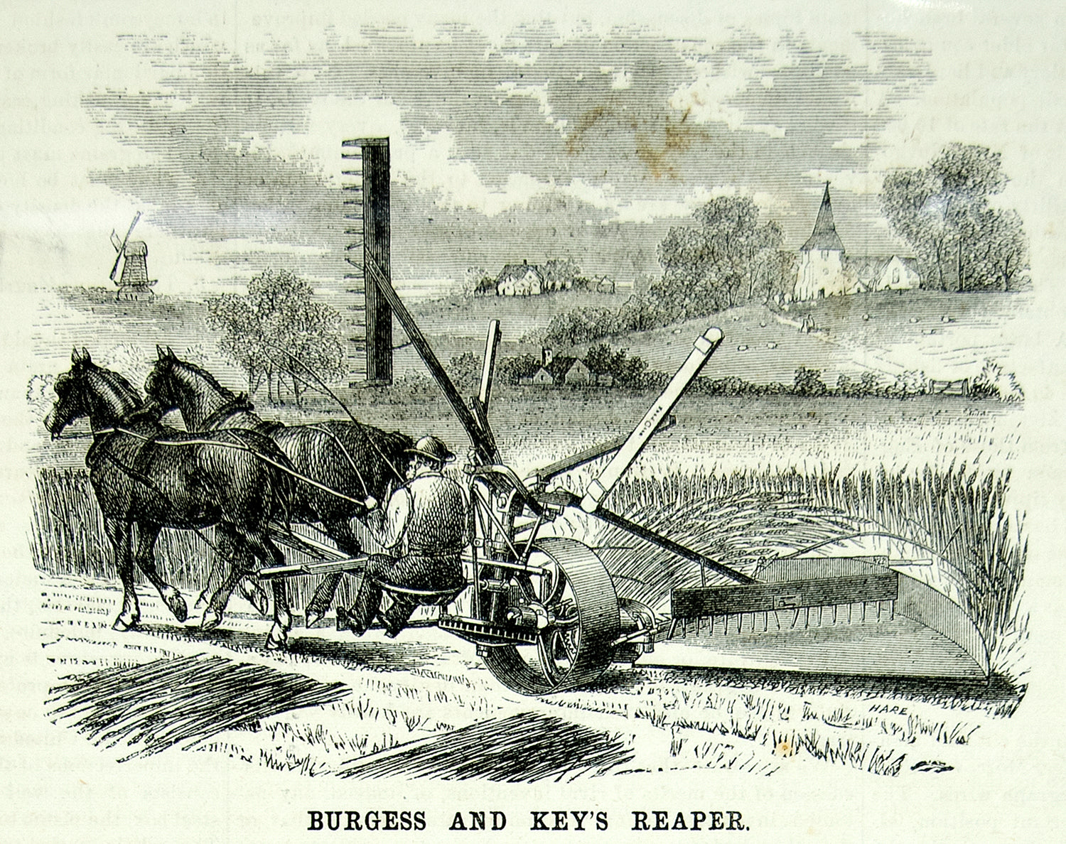This is an original 1875 black and white in-text wood engraving of an improved reaper made by Burgess & Key, London.