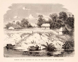 Keywords specific to this image: South America, Brazil, Shore, Waterway, Nature, Outdoor, Landscape, Boat, Indian, Ethnic, Tribe, Indigenous, Tropics, Jungle, Rainforest, Hut, Town, Settlement, Steps