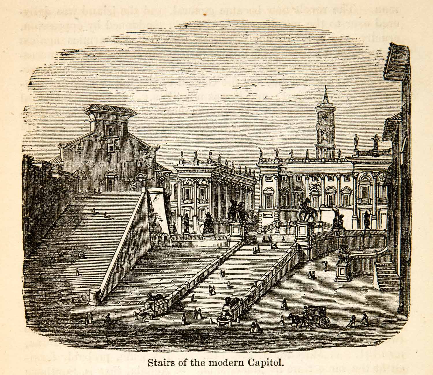 This is an original 1875 black and white in-text wood engraving of the stairs of the modern capitol in Italy.