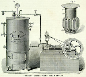 This is an original 1875 black and white in-text wood engraving of a Little Giant Steam Engine manufactured by Ward B. Snyder, 84 Fulton Street, NYC.