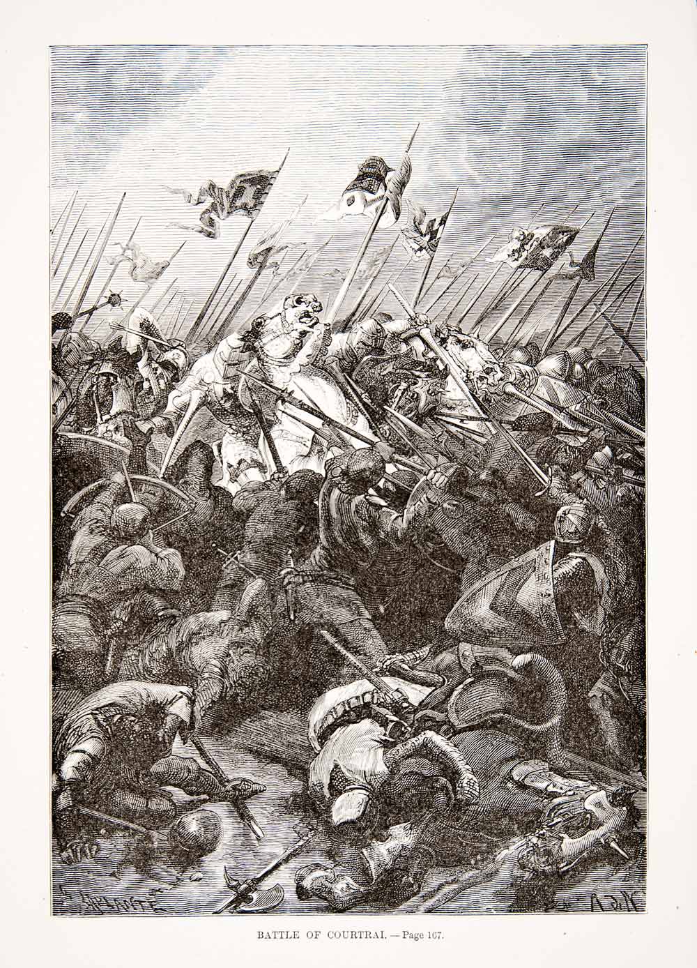1875 Woodcut Alphonse Neuville Battle Courtrai Golden Spurs Flanders XEA6