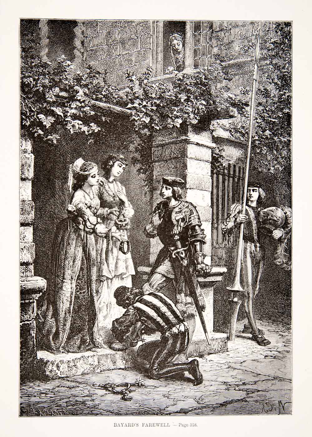 1875 Woodcut Alphonse Neuville Chevalier Bayard Armour Maiden Italian Wars XEA6