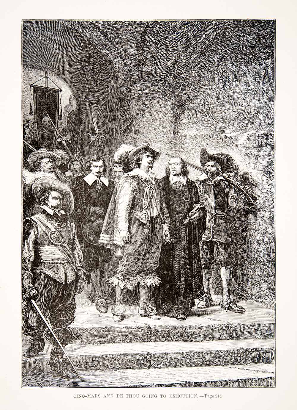 1875 Woodcut Alphonse Neuville Coiffier Cinq-Mars De Thou Execution 17th XEA6