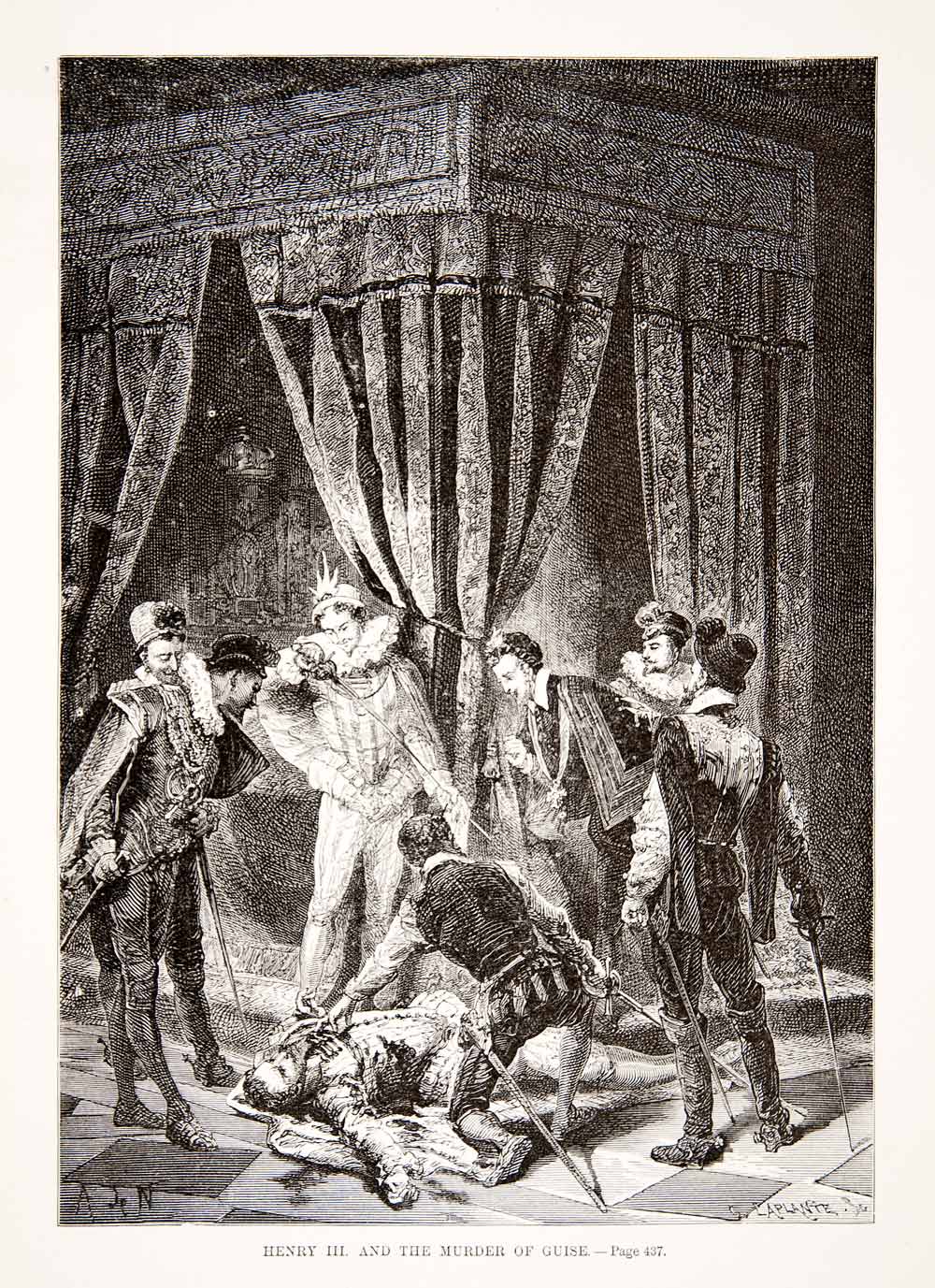 1875 Woodcut Alphonse Neuville King Henry III Murder Duke Guise Balafre XEA6