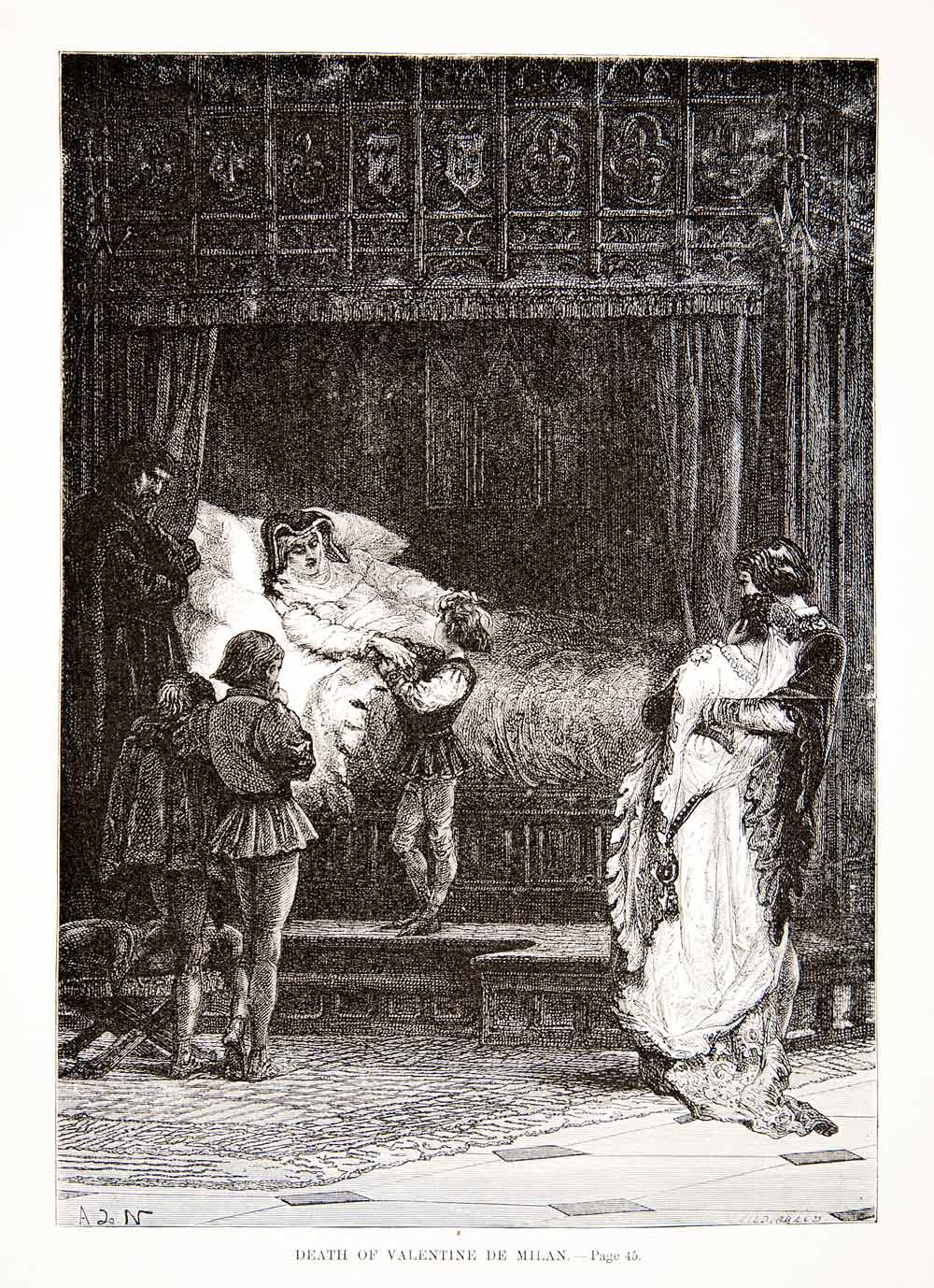 1875 Woodcut Alphonse Neuville Valentine Milan Deathbed Valentina Visconti XEA6