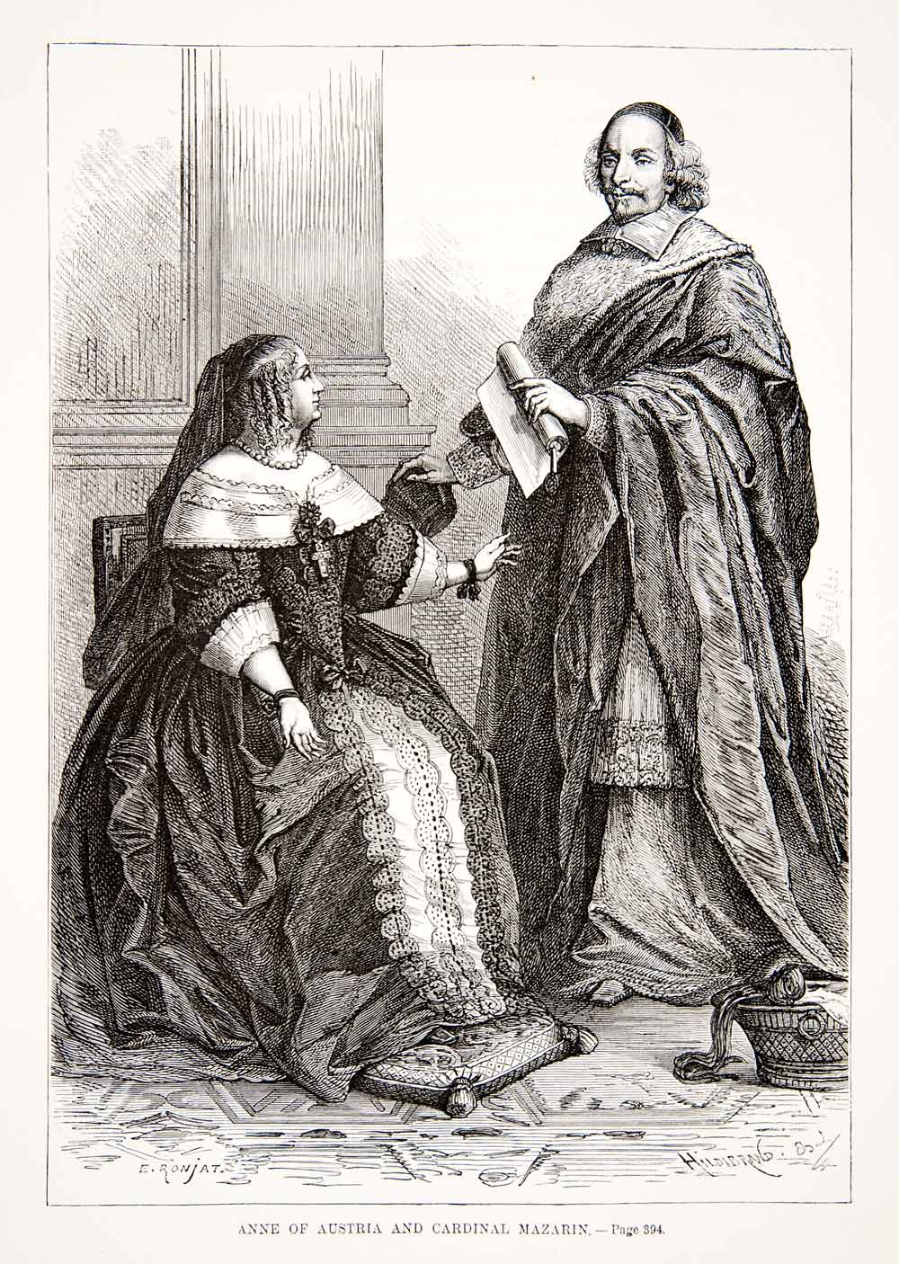 1875 Woodcut Eugene Ronjat Anne Austria Cardinal Mazarin 17th Century XEA6