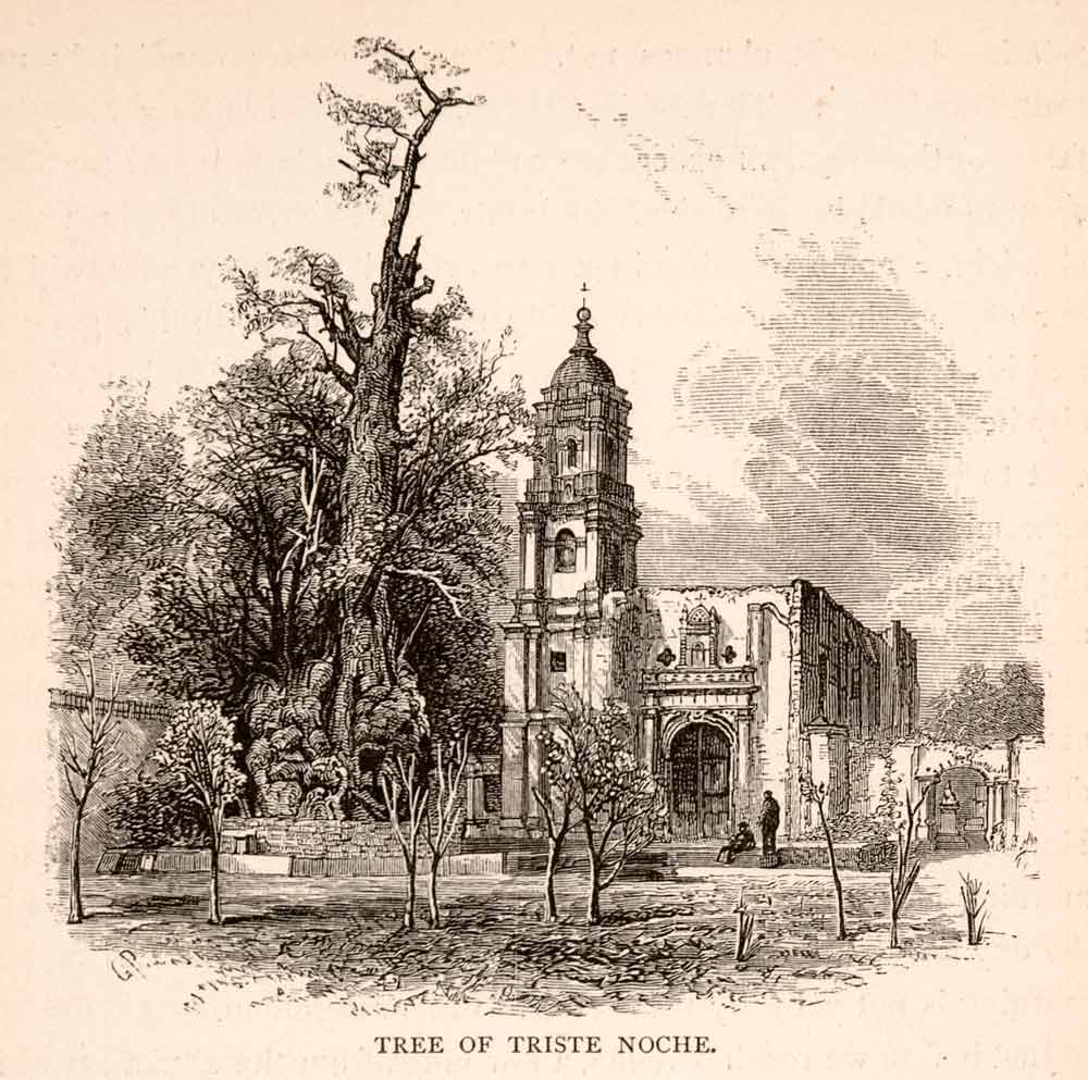 This is an original 1875 monochrome woodcut of "Tree of Triste Noche." This tree, a huge and gnarled cypress, is held as a monument to Spanish conquest. It marks the point where Hernán Cortés and his army of Spanish conquistadors paused on the night of June 30, 1520 on their escape from the capital of Tenochtitlan. Following the death of Montezuma, the Aztec King whom the Spanish were holding hostage, Cortes and his men were forced to fight their way out of the capital at great cost in both lives and teasure. Roughly a year later, the Spanish would complete their conquest of the indigenous peoples of Mexico.
