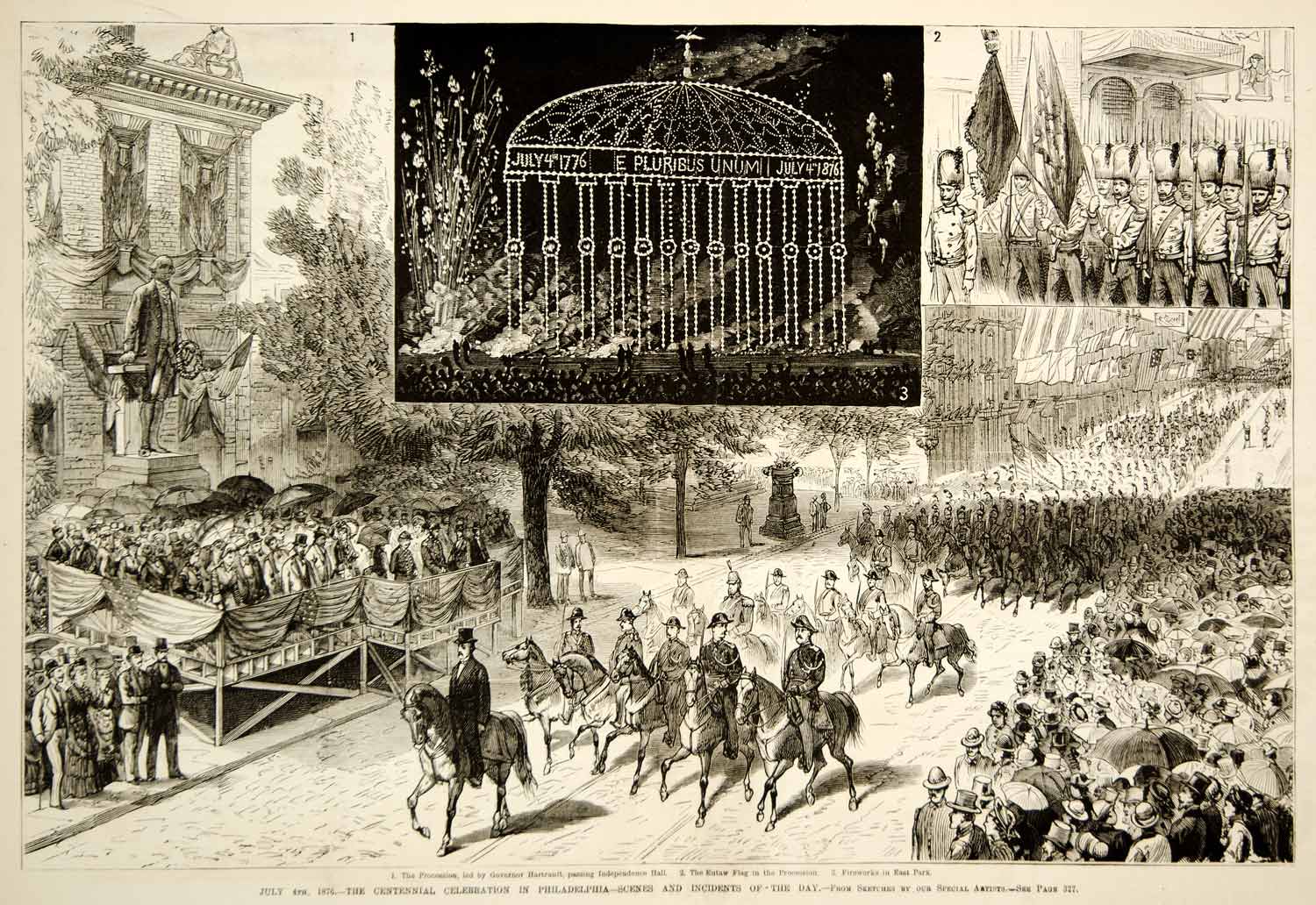 1876 Engraving Centennial Exposition Philadelphia Fair July 4 Parade Fireworks