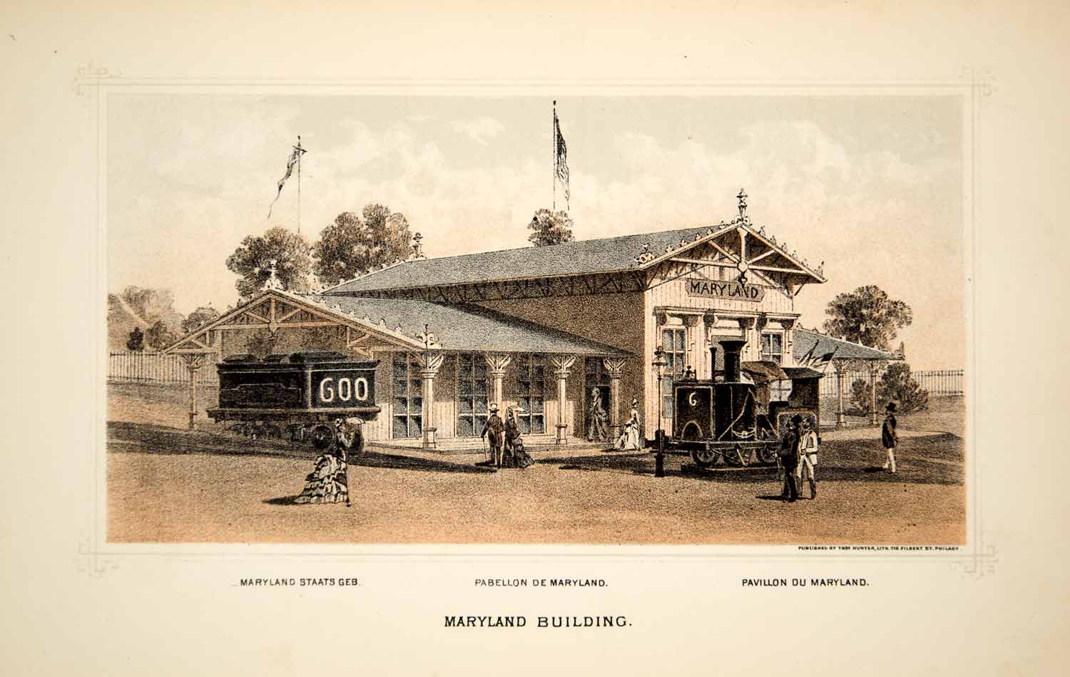This is an original 1876 color lithograph of the Maryland State Building at the 1876 Centennial Exposition.