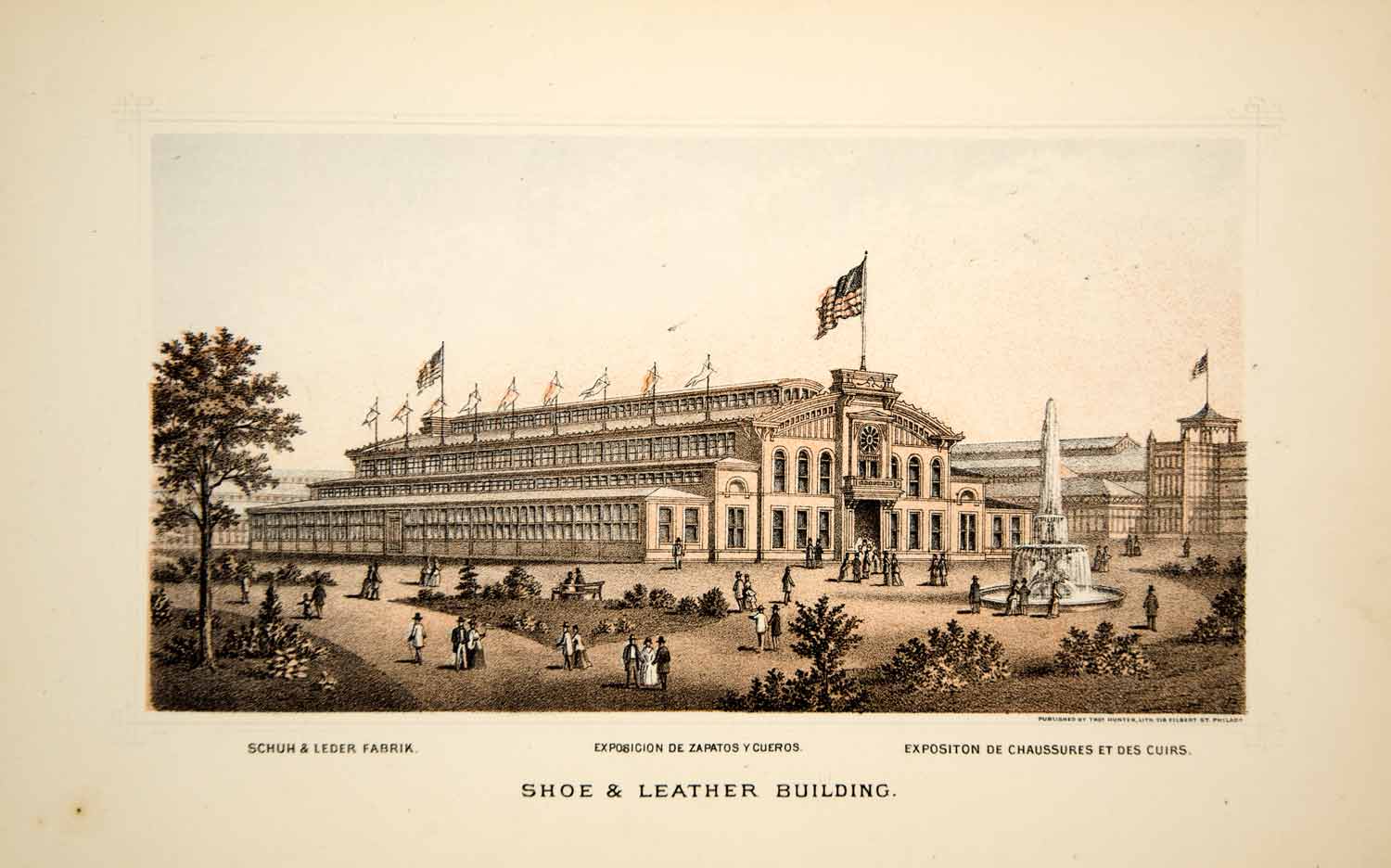 This is an original 1876 color lithograph of the Shoe & Leather Building at the 1876 Centennial Exposition. The building measured 314 x 160 feet and cost $31,000 to build. Architect: Alexander B. Bary.