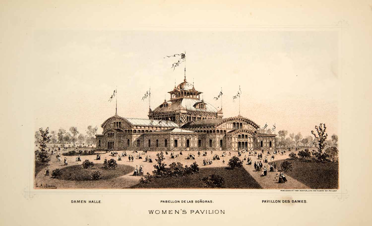 This is an original 1876 color lithograph of the Women's Pavilion at the 1876 Centennial Exposition. Despite the work of countless women to bring their exhibits to the Exposition, "for obvious reasons this object could not be effected in the general Exhibition Buildings" and all women's work was relegated to this building.