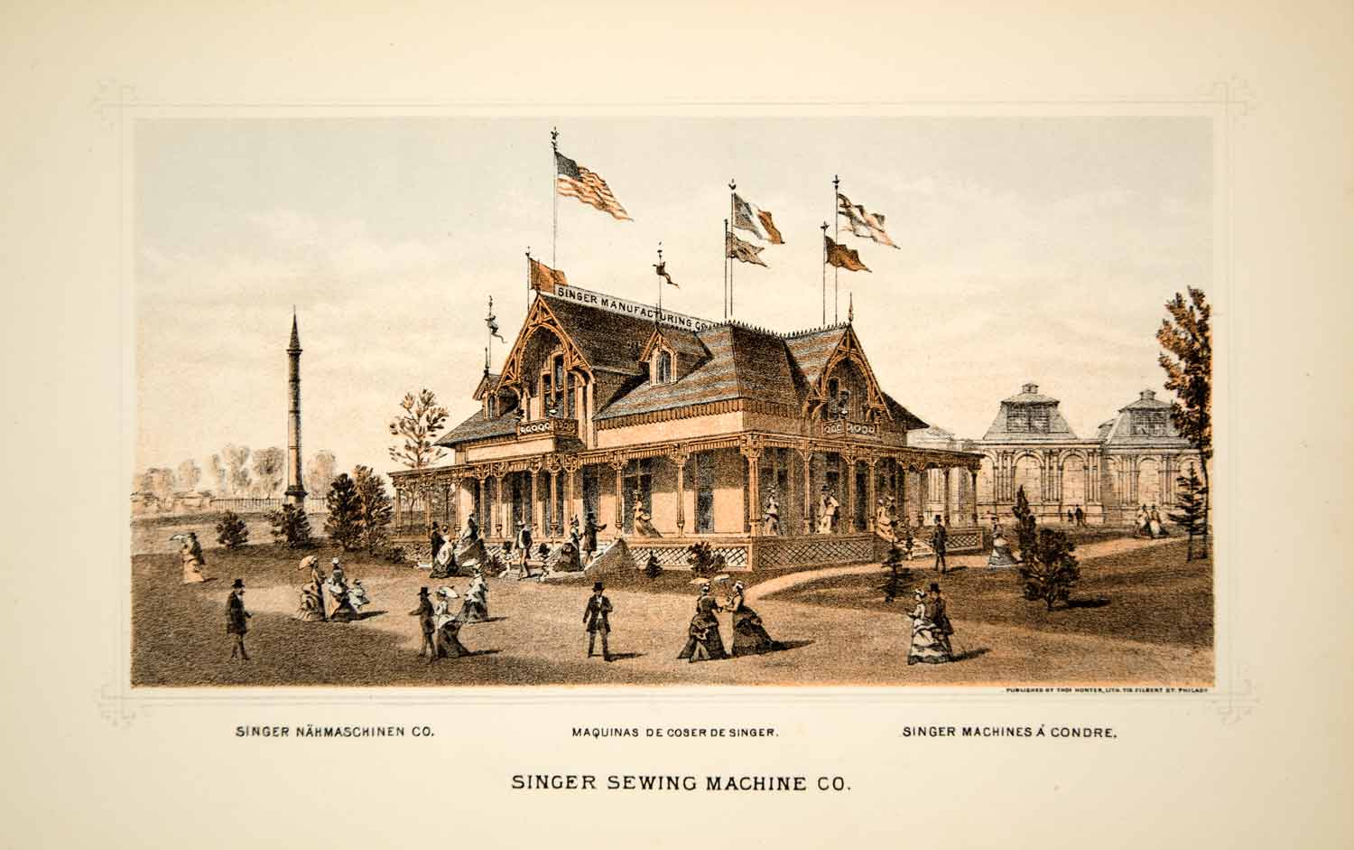 This is an original 1876 color lithograph of the Singer (Sewing Machine) Manufacturing Co. Building at the 1876 Centennial Exposition.