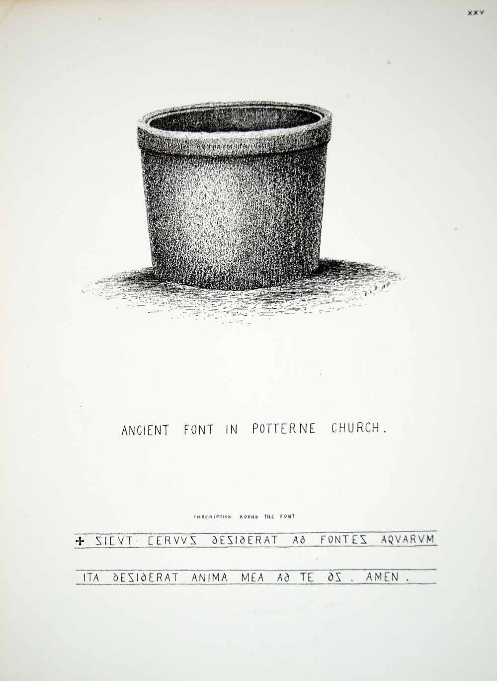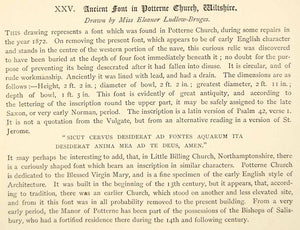This is an original 1876 black and white lithograph of a drawing by Eleanor Ludlow Bruges of the baptismal font from inside the 13th century Church of St. Mary the Virgin in the village of Potterne, Wiltshire, England, United Kingdom.