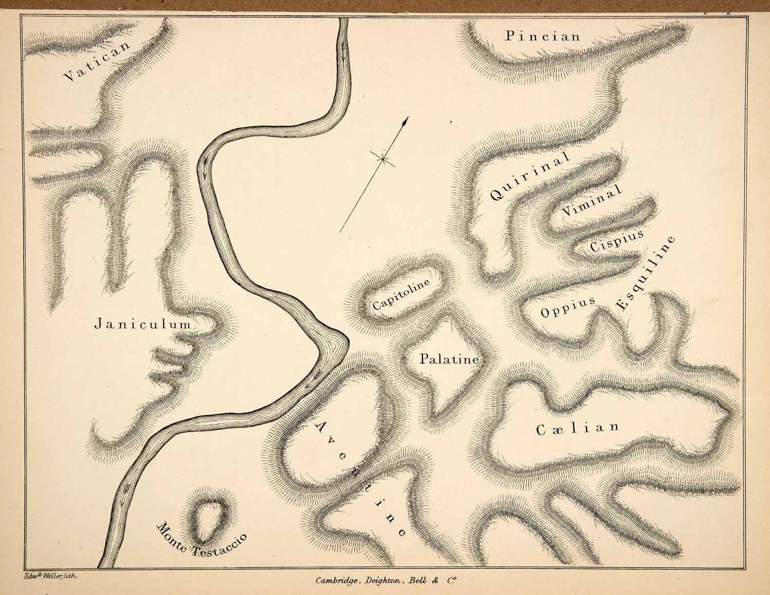 This is an original 1876 monochrome lithograph map of the Seven Hills of Ancient Rome.