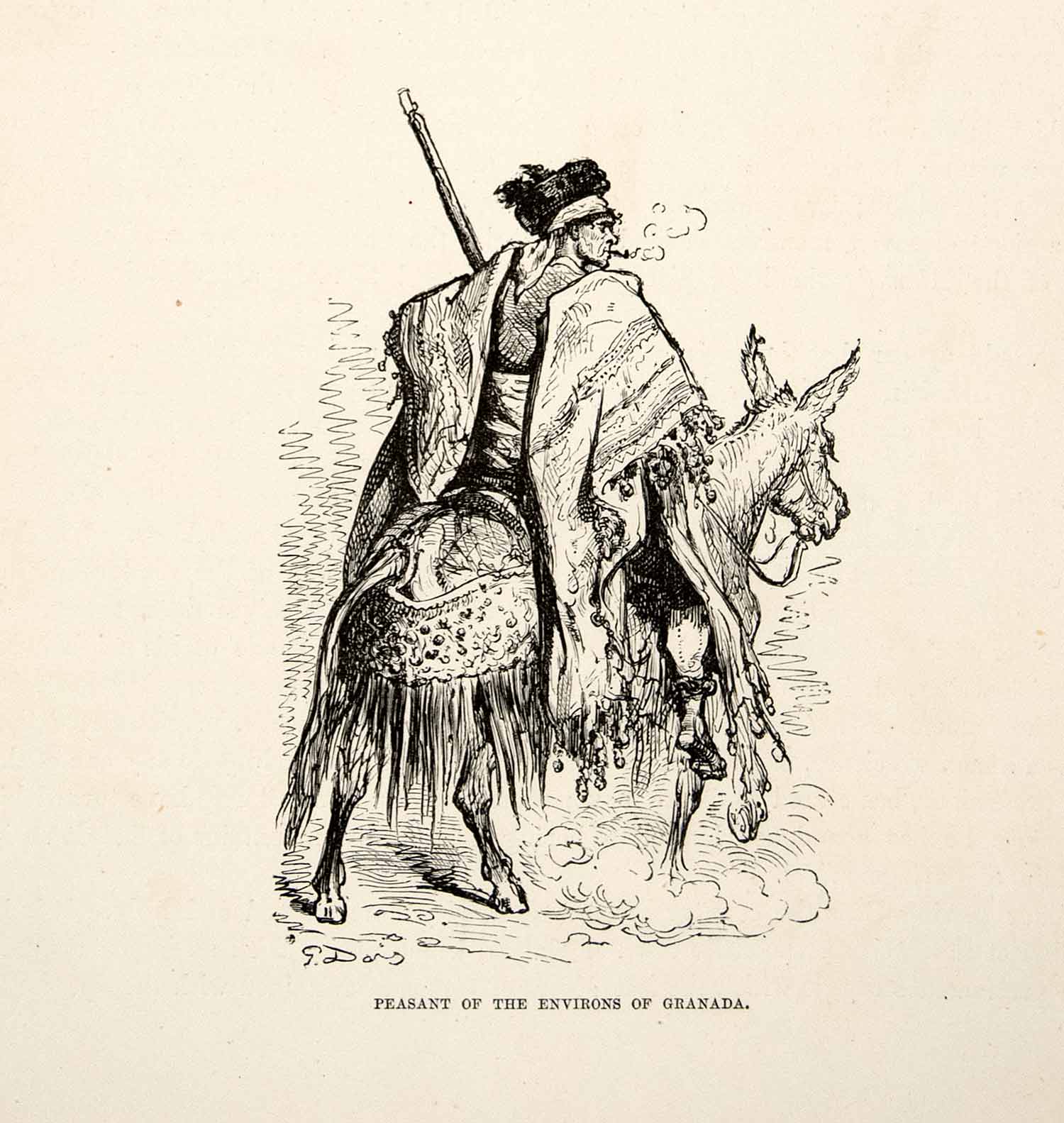 1876 Print Spain Andalusia Granada Peasant Costume Donkey Rider Burro Pipe XGJC4