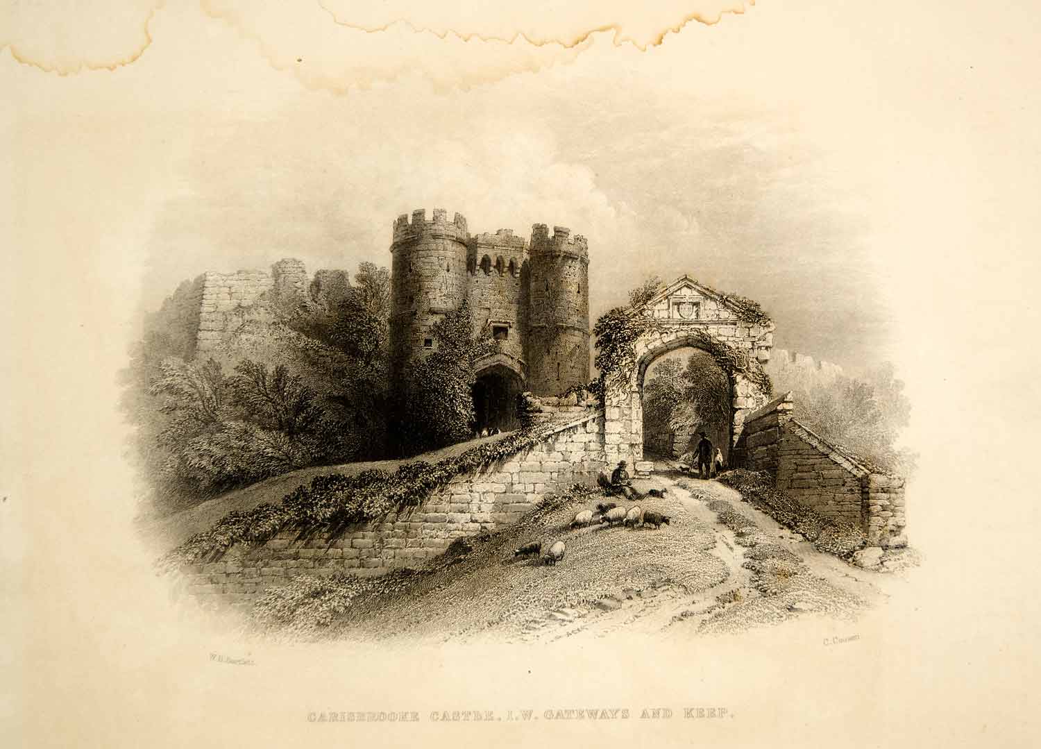 This is an original 1876 black and white steel engraving by William Henry Bartlett of the gateways and keep of Carisbrooke Castle, a motte-and-bailey castle in the village of Carisbrooke, on the Isle of Wight, England.
