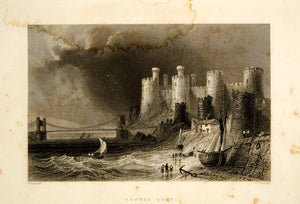 This is an original 1876 black and white steel engraving by William Henry Bartlett of Conwy Castle and quay in the town of Conwy, Wales.