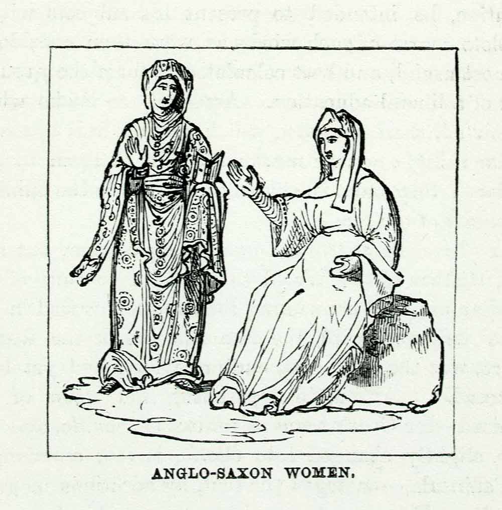 This is an original 1876 black and white in-text wood engraving of "Anglo-Saxon Women;" Britain.