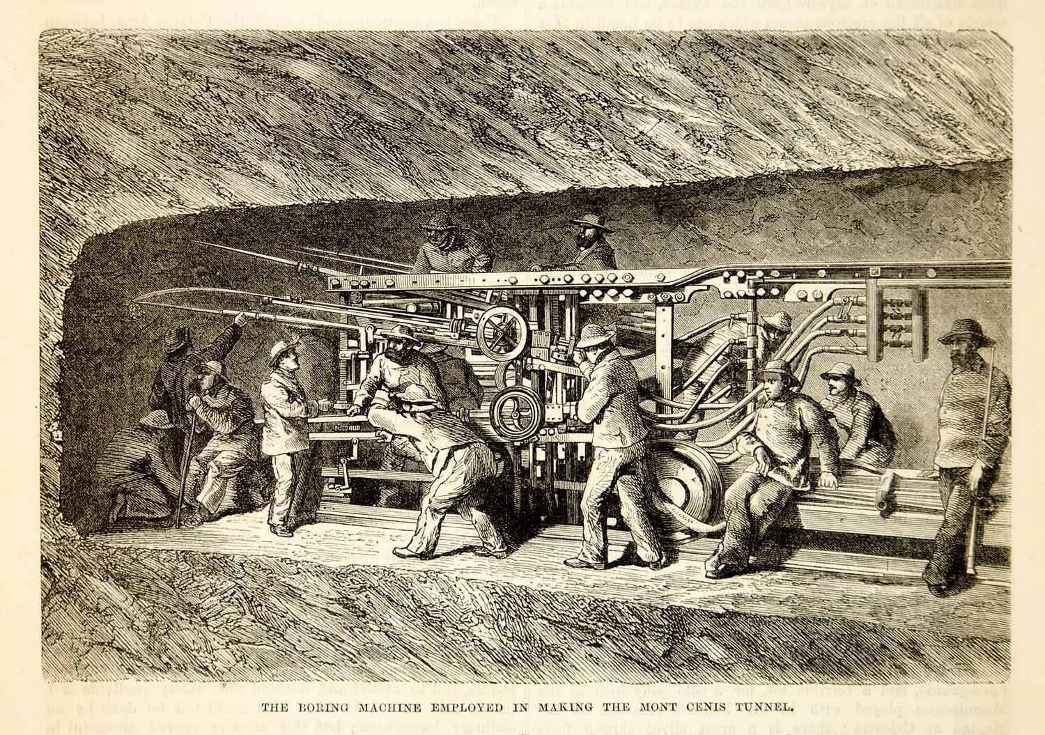 This is an original 1876 black and white in-text wood engraving of the boring machine used to excavate the Mont Cenis railway tunnel in the Cottian Alps on the border between France and Italy.