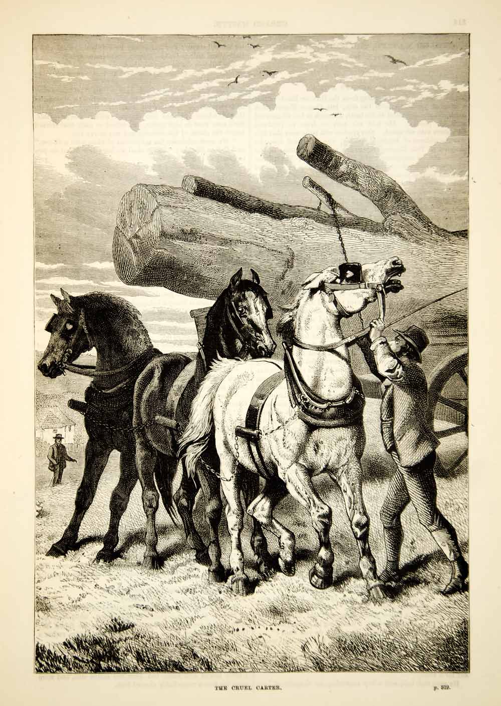 This is an original 1876 black and white in-text wood engraving of a carter cruelly beating the horses pulling his cart.