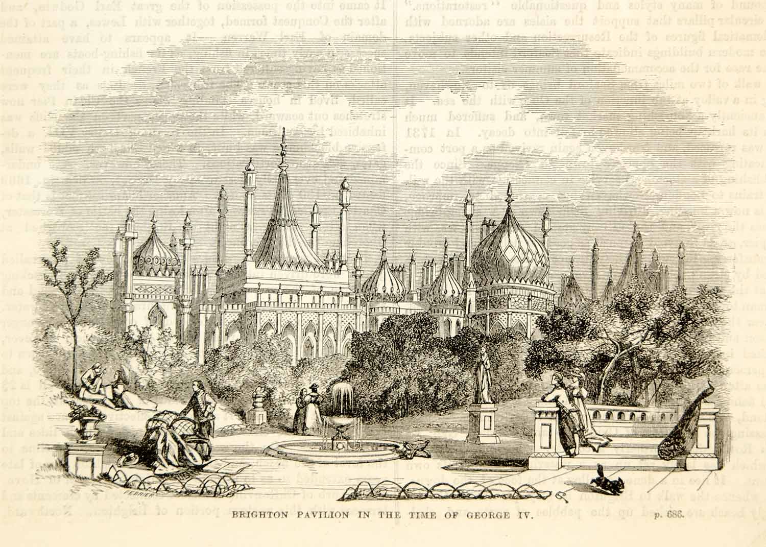 This is an original 1876 black and white in-text wood engraving of the Royal Brighton Pavilion at Brighton, England, a popular 19th century seaside resort.