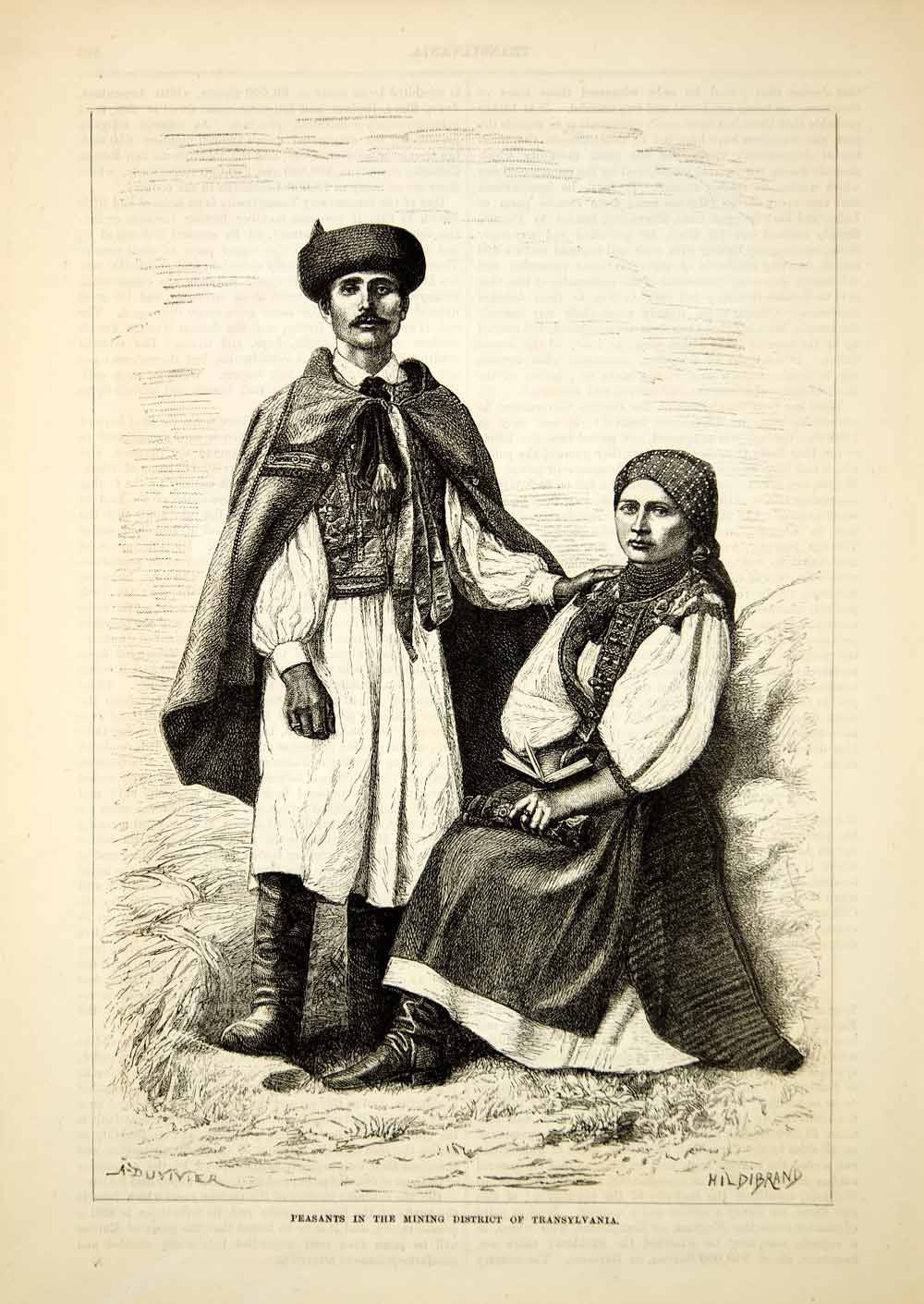 This is an original 1876 black and white in-text wood engraving of two peasants from the mining district of Transylvania.