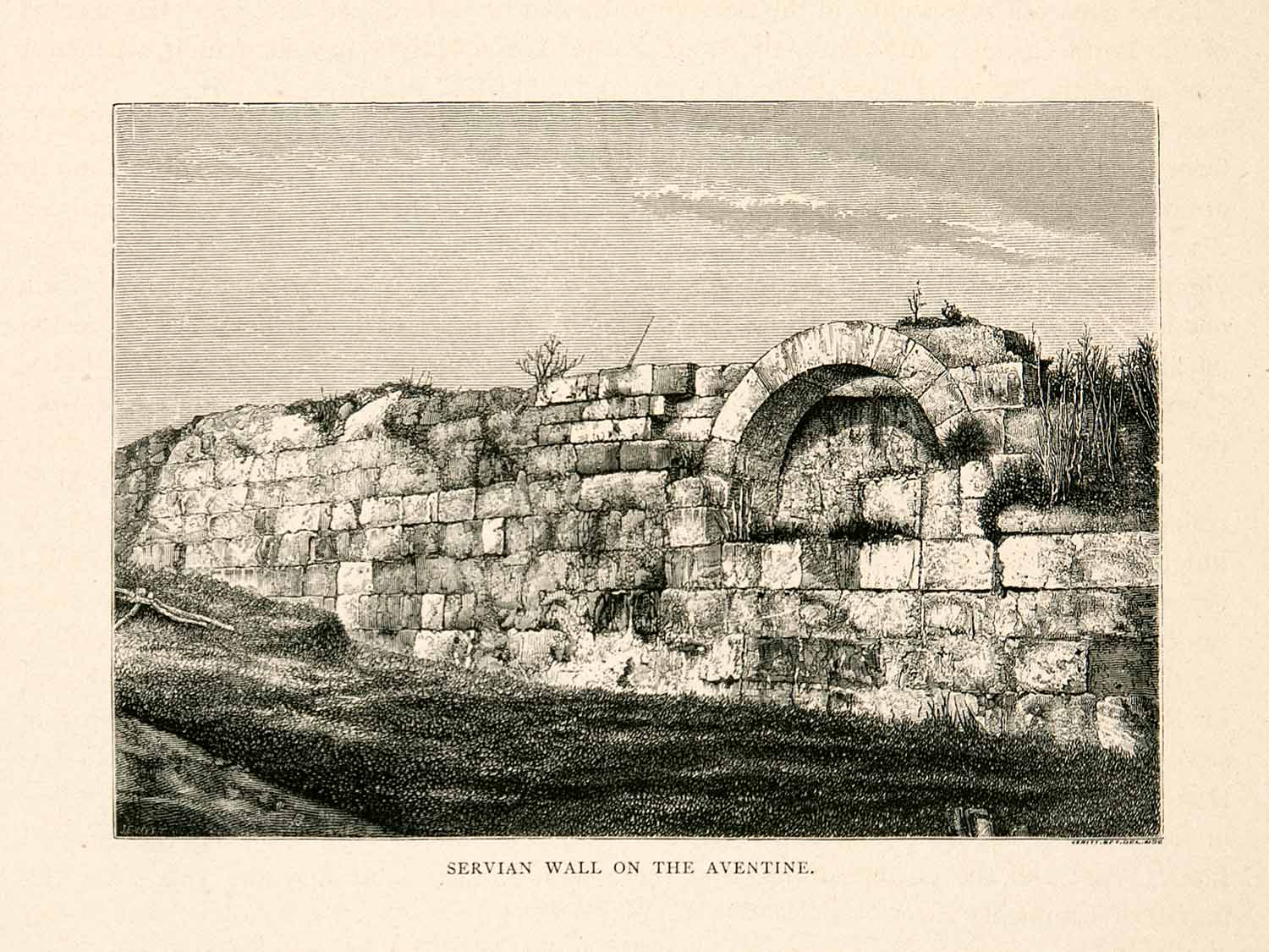 This is an original 1876 black and white in-text wood engraving of the Aventine Hill section of the Servian Wall, a defensive fortification of the Roman Republic.