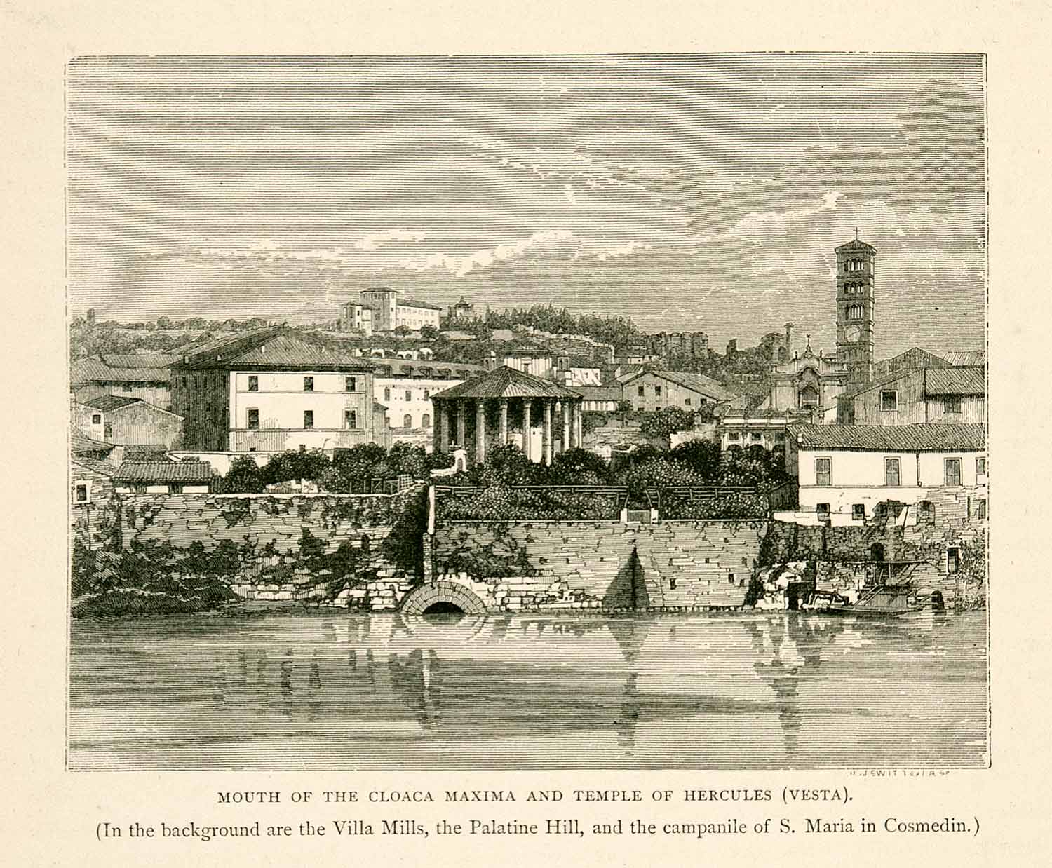 This is an original 1876 black and white in-text wood engraving of the Cloaca Maxima (Greatest Sewer) where it drains into the Tibur River in Rome, Italy.