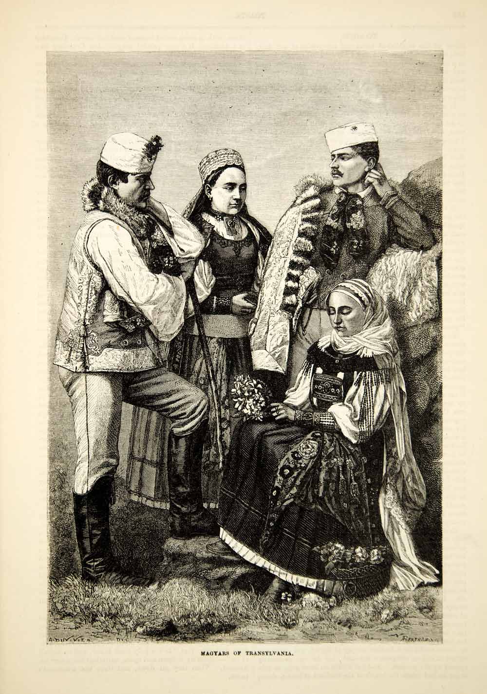 This is an original 1876 black and white in-text wood engraving of a group of Magyar people of Transylvania.