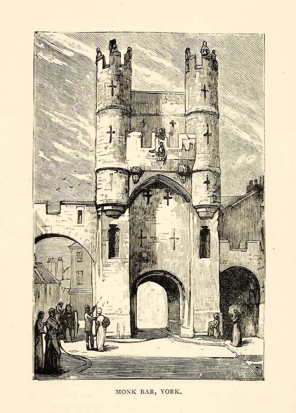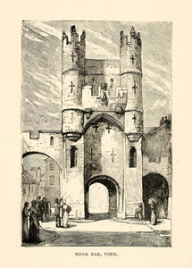 This is an original 1876 black and white wood engraving of 'Monk Bar, York" in Britain.