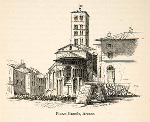 This is an original 1876 black and white in-text wood engraving of the Piazza Grande in Arezzo, Italy (Italia). Seen in the background is the Communal Palace.