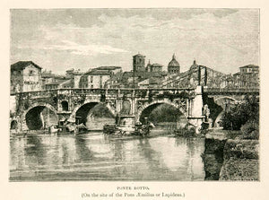 This is an original 1876 black and white in-text wood engraving of the Ponte Rotto in Rome, Italy. This mammoth bridge which crossed the Tiber fell into disuse in 1598 when half of the bridge was taken by a flood. More interestingly, this image was produced less than a decade before the remaining arches were demolished leaving only one that still stands today.
